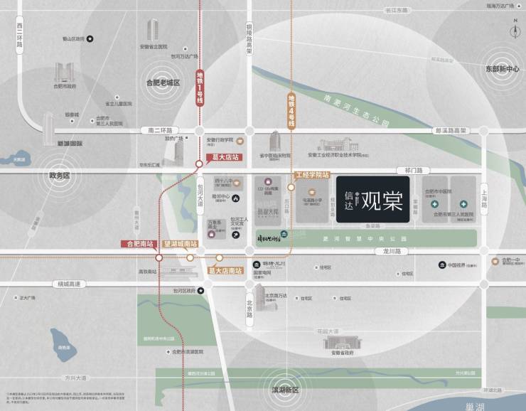 信达观棠项目周边近年开发集中,优质配套逐渐落位,紧邻教育、医疗配套,开发潜力相对较大。北侧为安徽工业经济职业技术学院(东区),西侧为屯溪路小学祁门路校区,南侧淝河智慧中央公园,东侧为合肥市第三人民医院新区(在建)。