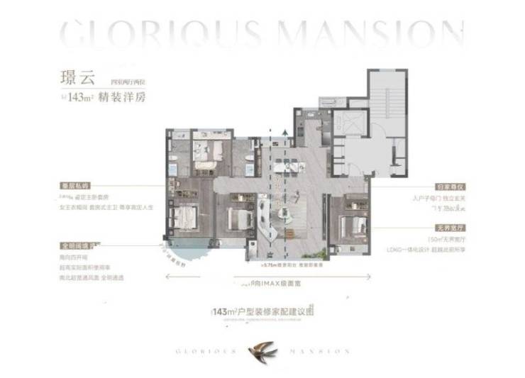 143㎡的四室两厅两卫户型采用了LDKG一体化设计,餐厅客厅阳台无缝连接,打造流畅的居家动线,为居住者提供更多共享空间。约11.3米南向超大面宽,双卧朝南,采光通风俱佳。主卧套房设计配备南向飘窗、独立卫生间、双衣帽柜,为居住者提供便捷、私密的居住体验。这种户型的设计不仅考虑到了居住者的生活需求,还充分利用了空间,让整个家庭都能够享受到舒适的生活环境。