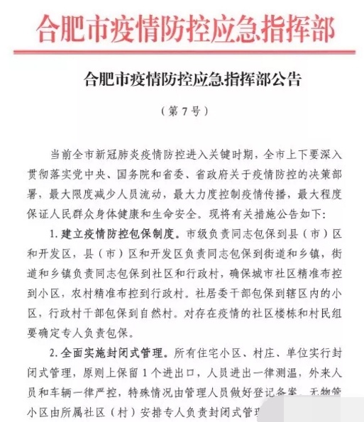 刚刚!合肥市疫情防控应急指挥部发布第7号公告,公告显示合肥所有住宅、小区、村庄实行封闭管理!