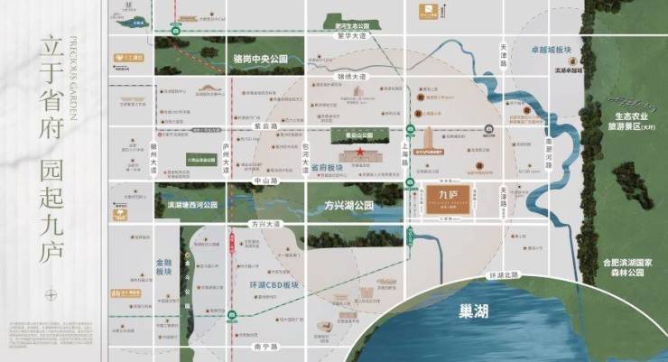 天赋生态:南望巢湖,方兴湖公园、塘西河公园、滨湖国家森林公园等布局四周,造就城芯自然谧境;