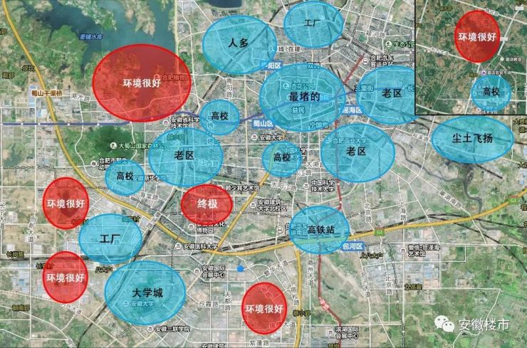 这是合肥几个主要区域的大致定位。其中,称得上环境不错的区域主要有6个,也就是上图标红的6个区域,值得我们关注。