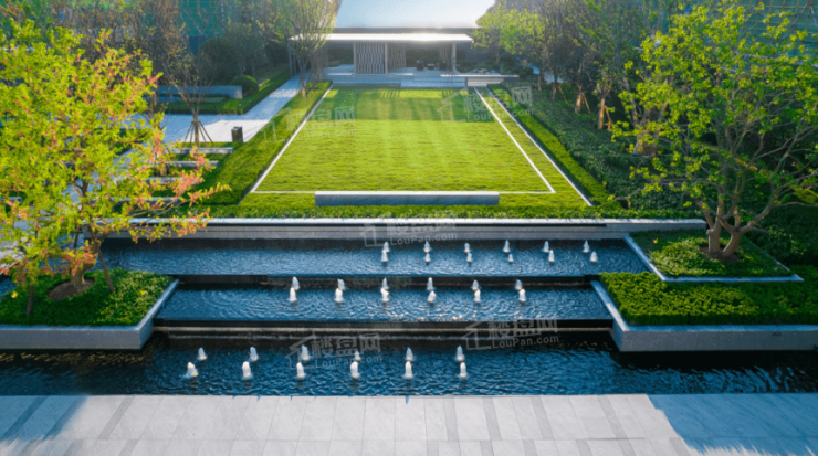 步行则由约70米的质灰景墙大门进入,经由光影连廊,体会水景与光影搭配的仪式感,一路穿越时光三叠水、阳光大草坪,赏阅自然胜景,进入装修大堂,搭乘品牌电梯直至私密入户空间。