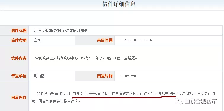 搜小狐在合肥市12345政府服务直通车网站上,也看到了市民询问政务区天鹅湖购物中心(i more)烂尾何时解决。