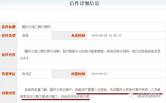 2019年2月19日,包河区在回复网友咨询时表示:经骆岗街道了解,国开公司已破产,目前资产管理人已进驻,先对国开公司进行清产核资,三月底结束后对三期工程进行施工,符合条件后尽快交房。