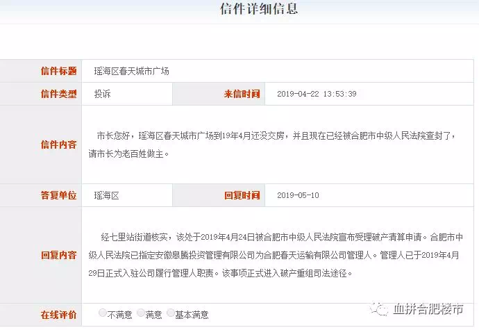 网友咨询:瑶海区春天城市广场到2019年4月还没交房,并且现在已经被合肥市中级人民法院查封了,请市长为老百姓做主。