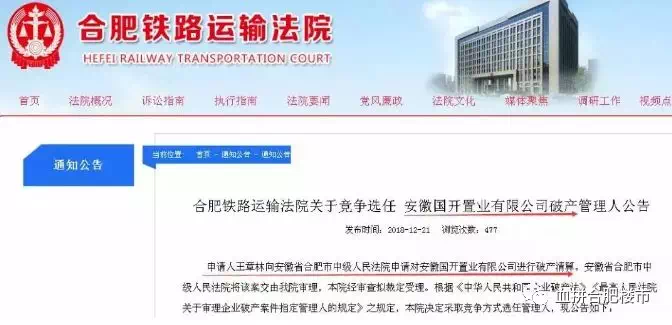 随后该案件被交由合肥铁路运输法院审理,后者为此还特地发布公开竞争选任国开置业破产管理人公告。