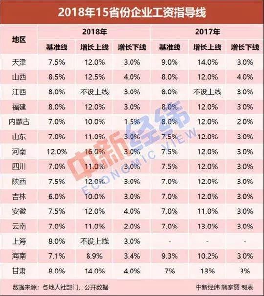 对比15省份2017年与2018年的数据发现,除了上海 (2017年企业工资指导线不明确 ) ,今年多地企业工资指导线的基准线、上线和下线有所上调。