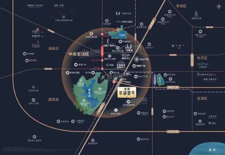 龙湖翠湖壹号为坐标,周边5公里范围之内都是合肥市区的黄金地段,也就是大家最向往居住的政务区生活圈。项目紧邻锦绣大道及金寨南路,距离地铁3号线工大翡翠湖校区约800米,距离合肥经开实验学校约500米,距离翡翠湖约1公里,3公里范围内有明珠广场、正大广场、星达城等。