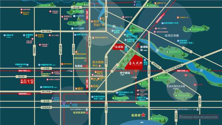 合家资讯6月21日消息,金隅大成郡位于包河区南二环与南淝河路交口,紧邻二环内主城,处在淝河片区靠北的位置。项目总占地227.7亩,总建筑面积50.67万方,共规划建有22栋高层,5栋小高层,16栋洋房,容积率2.5,共规划3304户。项目分为A、B两个地块,A地块规划8栋高层,2栋小高层,6栋洋房,B地块规划14栋高层,3栋小高层,10栋洋房。项目整体采用南低北高的布局,完整呈现小区天际线,保证了社区里每一户家庭的采光,通风和观景效果。