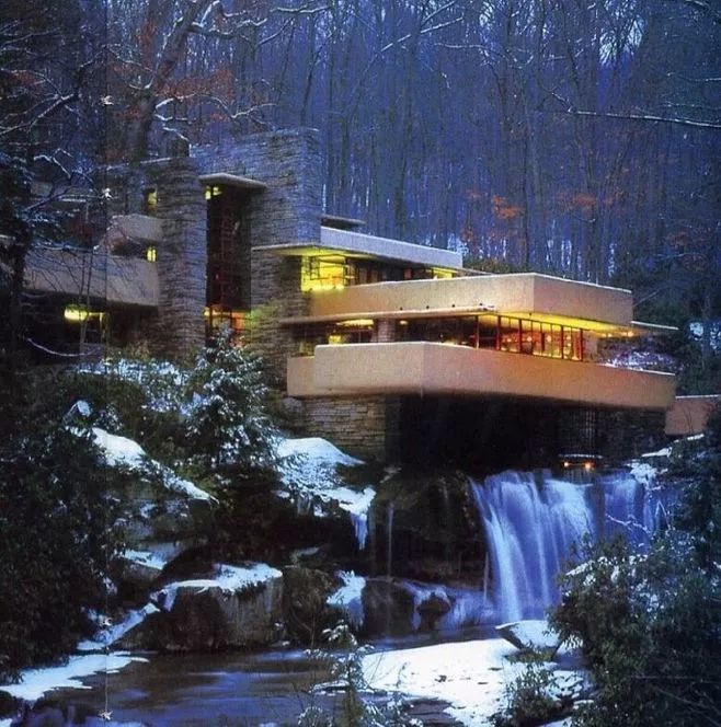 1934年,德裔富商考夫曼在宾夕法尼亚州匹兹堡市东南郊的熊跑溪买下一片地产。那里远离公路,高崖林立,草木繁盛,溪流潺潺。考夫曼把著名建筑师赖特请来考察,请他设计了一座周末别墅,这就是著名的“流水别墅”。