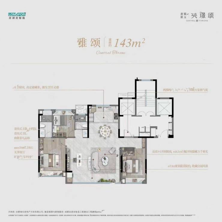 龙湖亚伦央璟颂项目的户型设计充分考虑居民的多元化需求,从143平的起步户型到180平的高奢主卧套房设计,均价30000元/㎡,具体一房一价,每种户型都注重私密性和生活品质。无论是独立候梯厅、入户双开门还是无界宽厅,每个设计细节都体现了产品的纯粹和高品质。