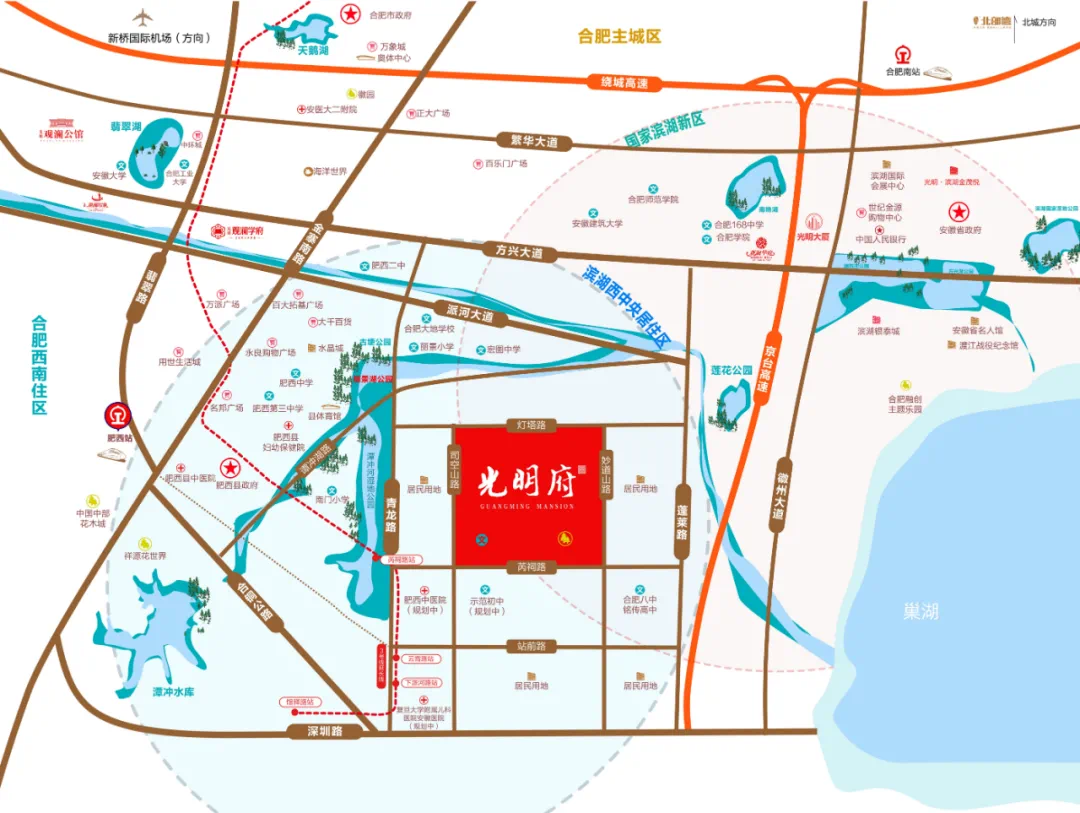 据2020年大建设计划,地铁3号线南延线,已经开工建设;肥西高铁站总投资1.5亿元,预计2020年11月投入使用;复旦大学附属儿科医院布局肥西上派,即国家儿童区域医疗中心。无论是实力还是一系列的配套,滨湖西板块都是飞跃式发展。光明府扼守滨湖西一线位置,其教育、医疗、地铁、公园等配套更是优质。