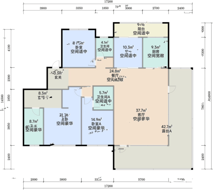 大平层户型作为项目的高端旗舰产品,以 “极致奢适、全景视野” 为设计目标,面积广阔,功能齐全,为高端客群打造专属的品质生活空间。户型采用全明通透设计,每个房间都有独立的采光面,客厅采用横厅设计,面宽可达 10 米以上,搭配全景落地窗,视野开阔无遮挡,将周边自然生态景观与社区园林景观无缝衔接,营造出 “客厅即观景台” 的居住体验。空间布局上注重圈层社交与家庭互动,客厅、餐厅、厨房采用 LDK 一体化设计,形成开阔的公共活动空间,适合举办家庭聚会、朋友宴请等高端社交活动;公共区域还规划有茶室、雪茄吧、影音室等功能空间,满足高端客群的多元化社交与休闲需求。