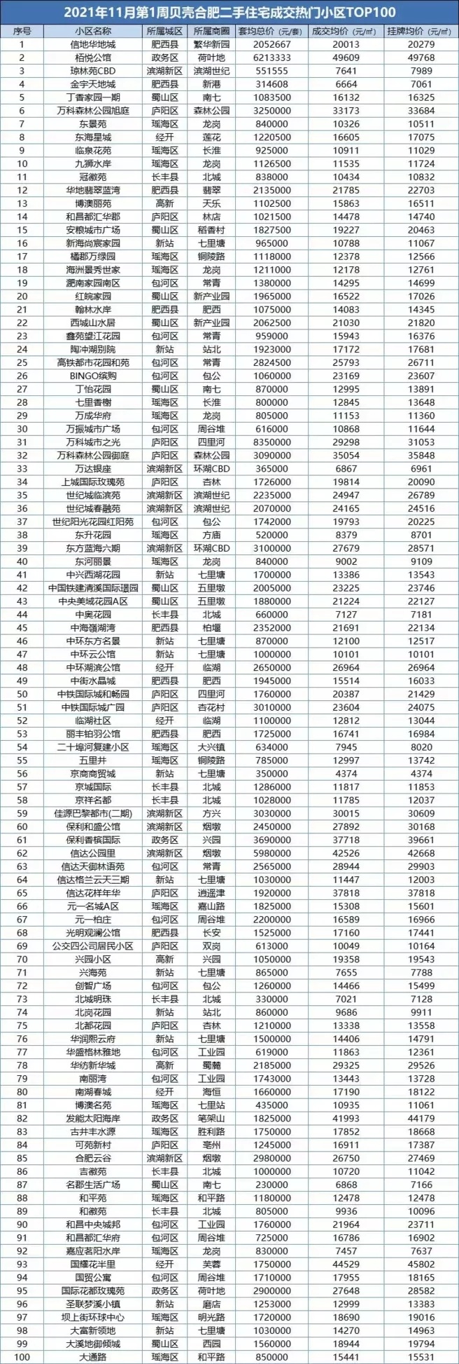 房居快讯11月15日消息,据贝壳数据显示,合肥11月第1周值得买的二手房小区TOP100排行榜。数据显示,热门成交的二手房小区大多房龄比较新,小区环境好,周边配套齐全。