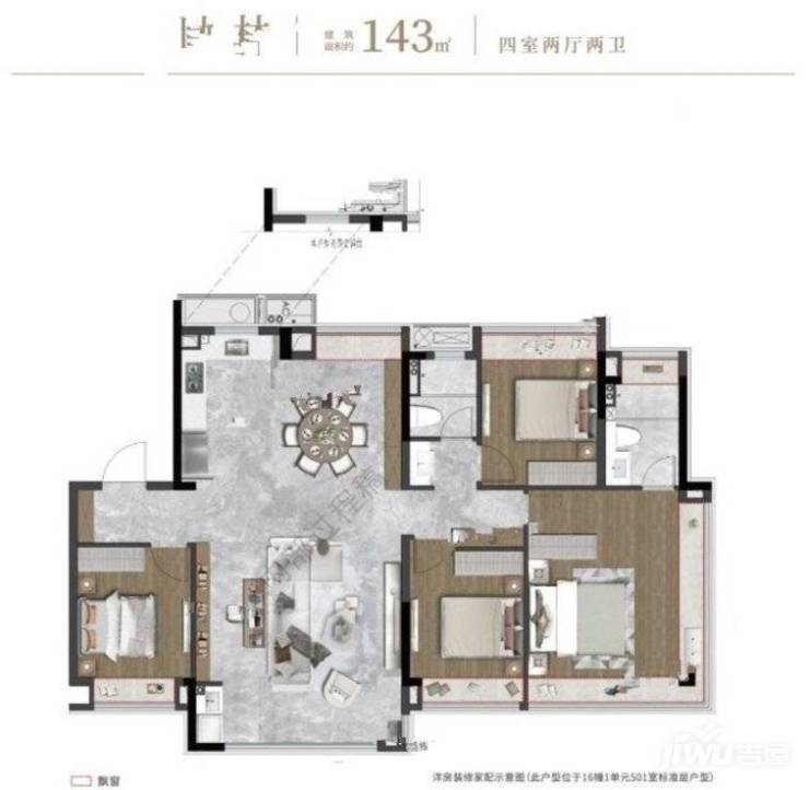 户型设计上,例如143平的户型产品,四室两厅双卫设计,户型方正,南北通透,客餐厨一体化设计,整合玄关、收纳等匠心设计,满足家庭成员多元化生活需求,另外还有主卧L型270°端厅的环幕采光,视野好,空间开阔明朗,有助于提升居住的舒适度。