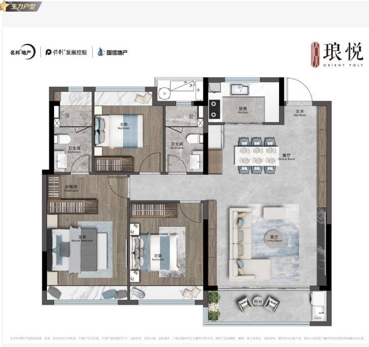 115㎡三室两厅两卫户型是空间设计的精品之作,充分展现设计匠心。该户型采用南北通透设计,三面采光、全方位景观,最大化引入自然光线的设计考量。超大观景阳台与客厅相连,宽敞气派,体现空间流动性的设计理念;豪华主卧套间,配备独立宽敞卫浴,彰显私密空间的精致设计。