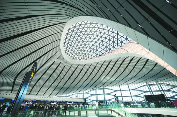 9月25日拍摄的北京大兴国际机场航站楼内部。北京大兴国际机场与天安门直线距离为46公里,是目前全球建设规模较大的新建机场。 据新华社