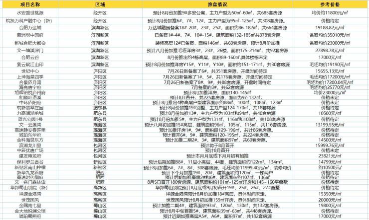 本次加推房源涵盖了公寓、高层、小高层、别墅、洋房等产品,既有预计均价1.3万的纯刚需盘,也有预计均价3.5万元/㎡的高端盘。在本次开盘预告中,开盘数量前三的分布是庐阳滨湖和瑶海,经开肥西依然是重点房荒区,8月仅有5盘推新。