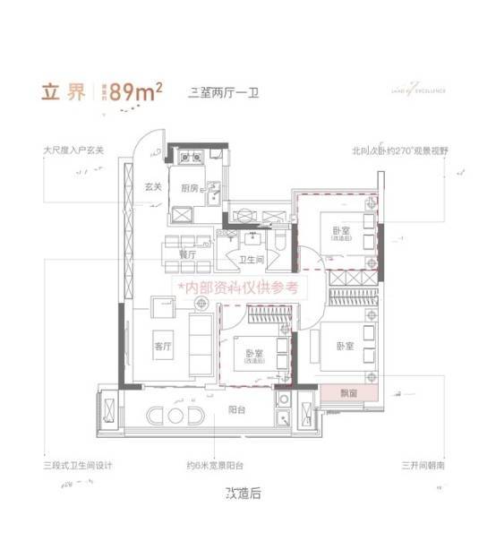 该户型采用三房两厅两卫的布局,主卧套房设计,自带衣帽间、卫生间,客卫三段式干湿分离设计,U形厨房方便操作,并做到了动静分区。户型方正,各个空间占比适宜,三个卧室都有一定的储物空间,利用率较高。南向采光面宽达10.9m,光线充足,全明户型保证良好通风。私密性也得到重视,阳台与次卧相连,客厅直接对外,主卧套房独立卫生间,保障居住隐私。