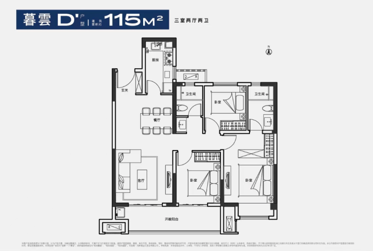 户型同样采用南北通透设计,客厅与餐厅相连,增加了公共活动空间的开阔感,日常家庭互动更加便捷。改善型户型以三房两厅两卫与四房两厅两卫为主,注重空间的舒适度与功能性。三房两厅两卫户型采用大面宽、短进深的设计,保证了充足的采光与通风。客厅宽敞明亮,连接宽景阳台,视野开阔,可将室外美景尽收眼底。