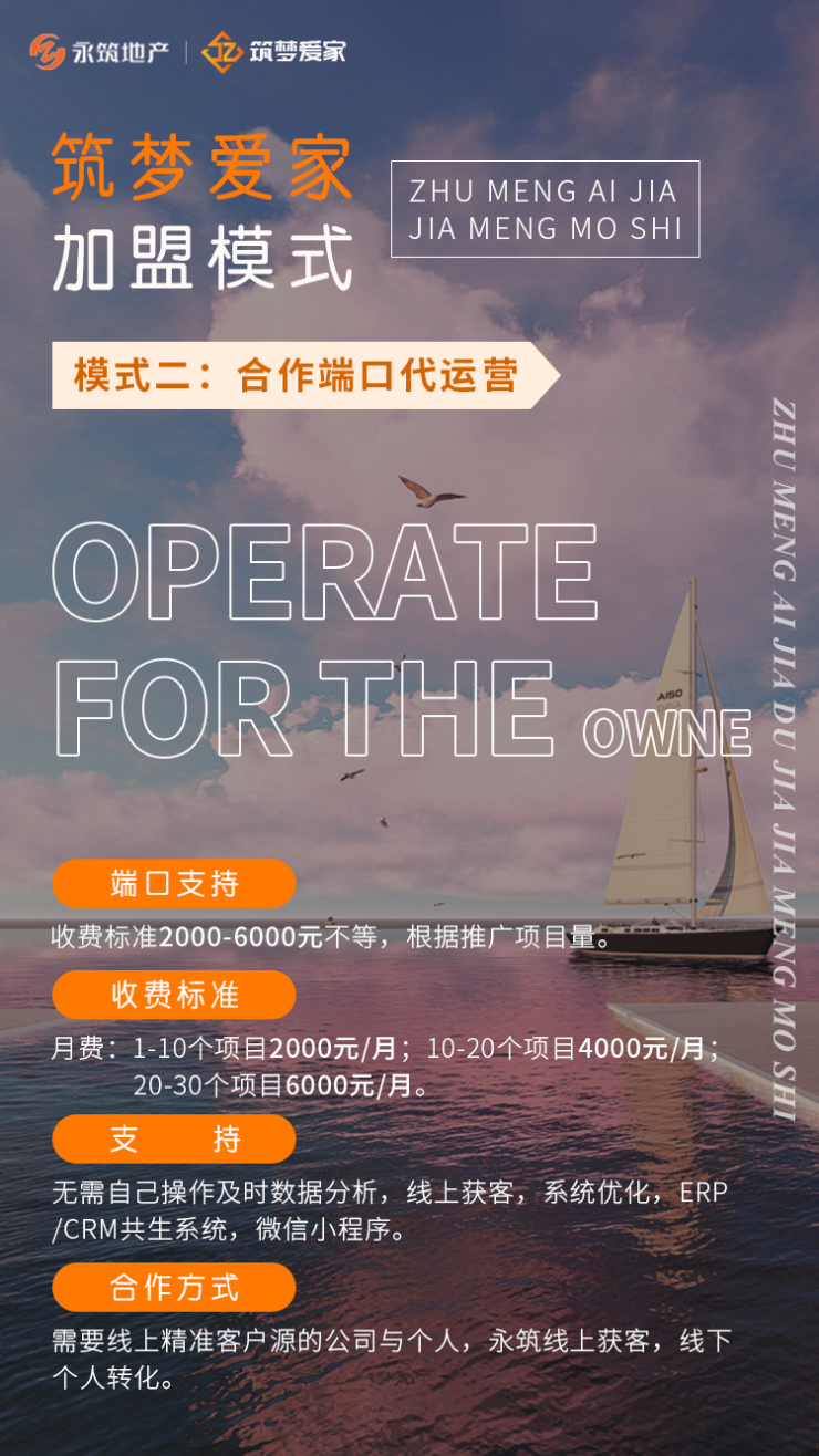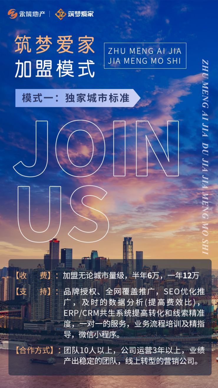 加盟优势:永筑可支持精选房源全面覆盖、热门楼盘全面覆盖、优质客源特别享用、ERP/CRM共生系统、微信小程序。